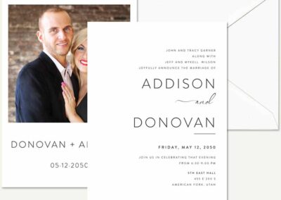 We offer a variety of design options for your wedding invitations, but if you don’t find exactly what you’re looking for, don’t worry! We can mix and match fonts, flowers, designs, and colors to perfectly match your wedding theme.